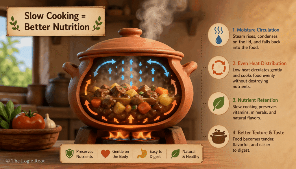 इसके अलावा, मिट्टी porous होती है। इसका मतलब है कि गर्मी और नमी धीरे-धीरे पूरे बर्तन में फैलती है। यही slow cooking का असली base है।